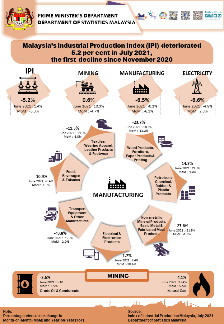 Malaysia’s Industrial Production Index (IPI) deteriorated 5.2 per cent in July 2021, the first decline since November 2020