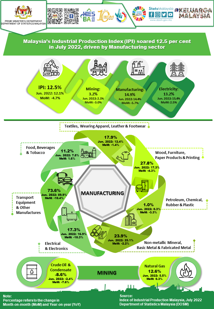 Malaysia’s Industrial Production Index (IPI) soared 12.5 per cent in July 2022, driven by Manufacturing sector