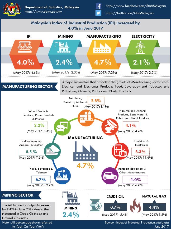 Malaysia’s Index of Industrial Production (IPI) increased moderately by 4.0% in June 2017