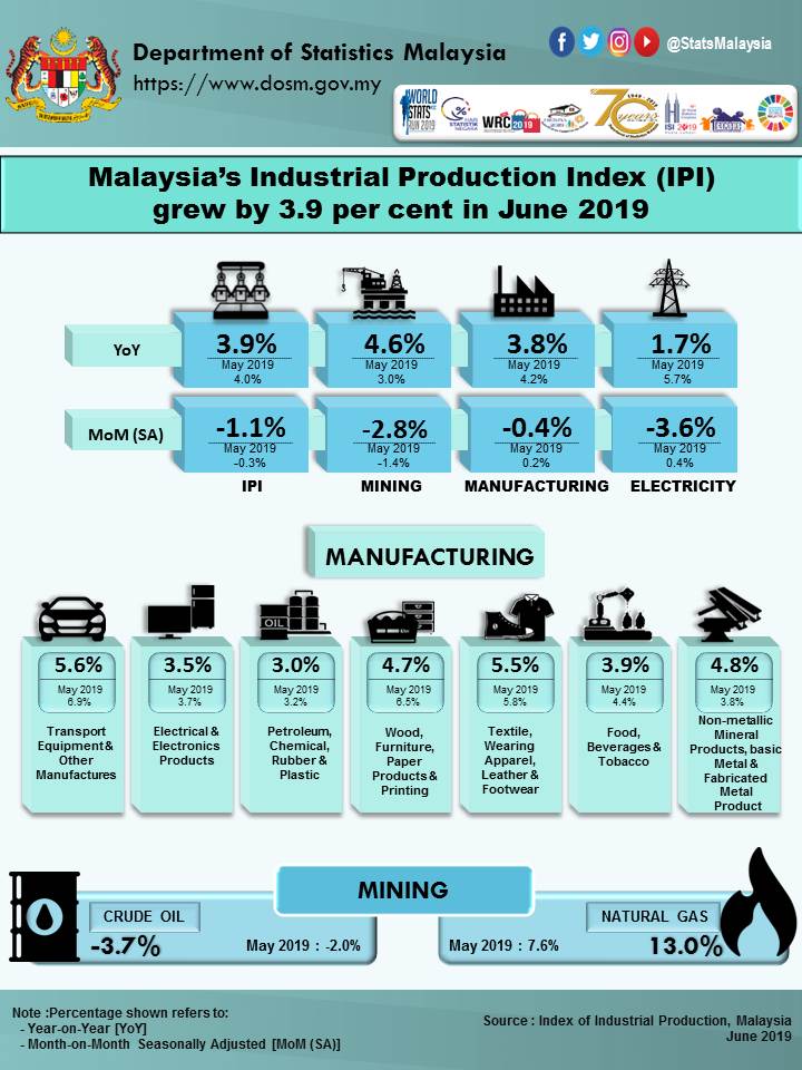 Malaysia’s Industrial Production Index (IPI) grew by 3.9 per cent in June 2019
