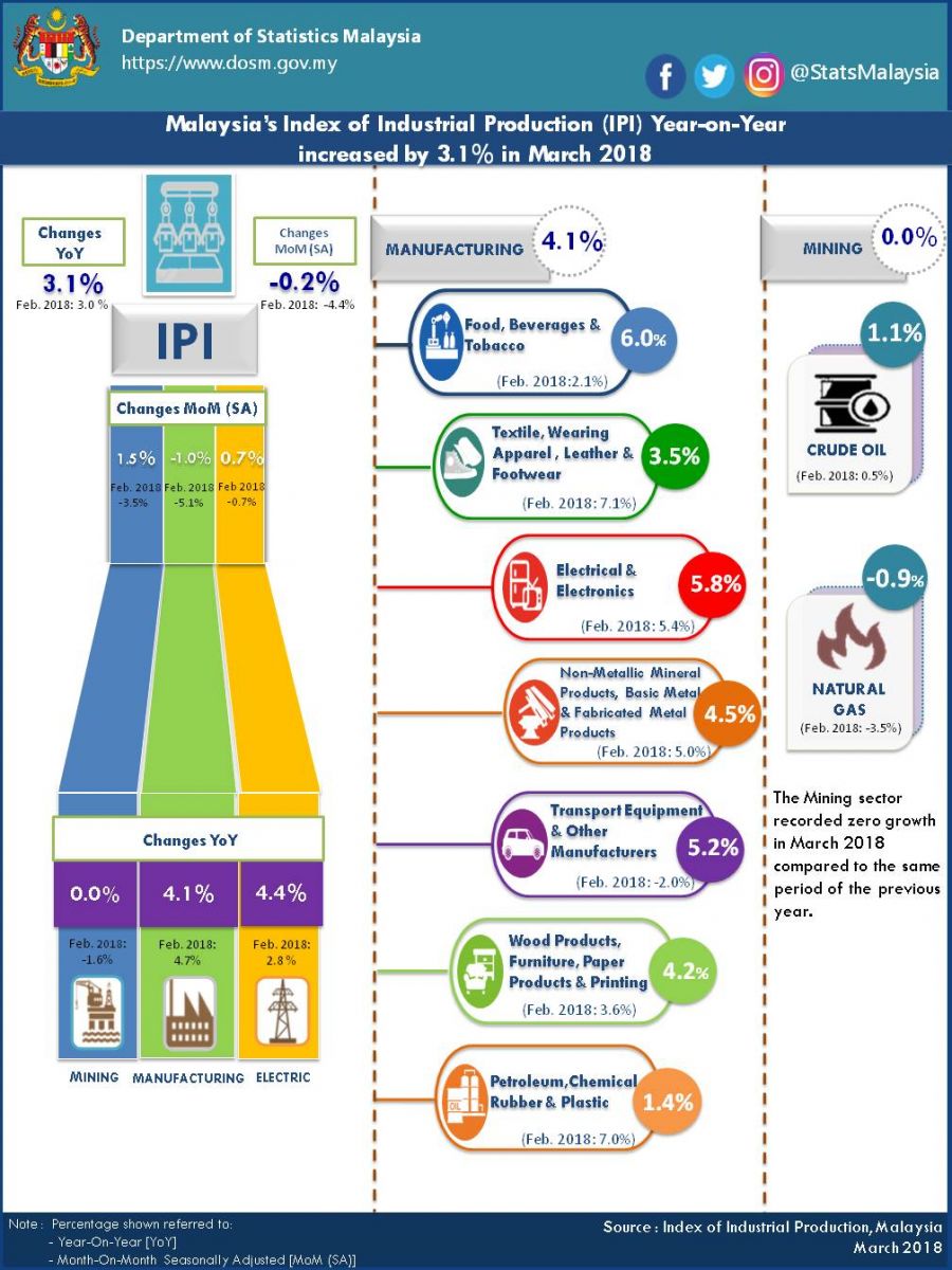 Malaysia’s Industrial Production Index (IPI) ) increased by 3.1 per cent in March 2018