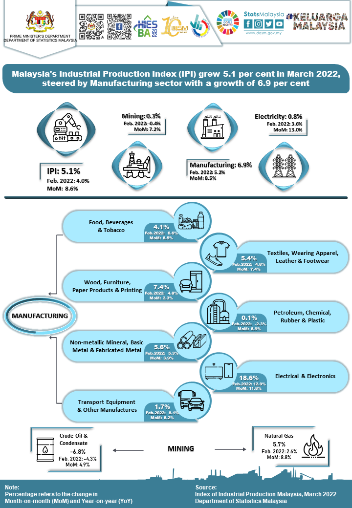Malaysia's Industrial Production Index (IPI) grew 5.1 per cent in March 2022, steered by Manufacturing sector with a growth of 6.9 per cent