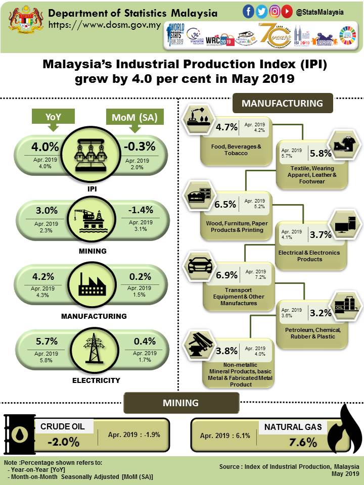 Malaysia’s Industrial Production Index (IPI) grew by 4.0 per cent in May 2019