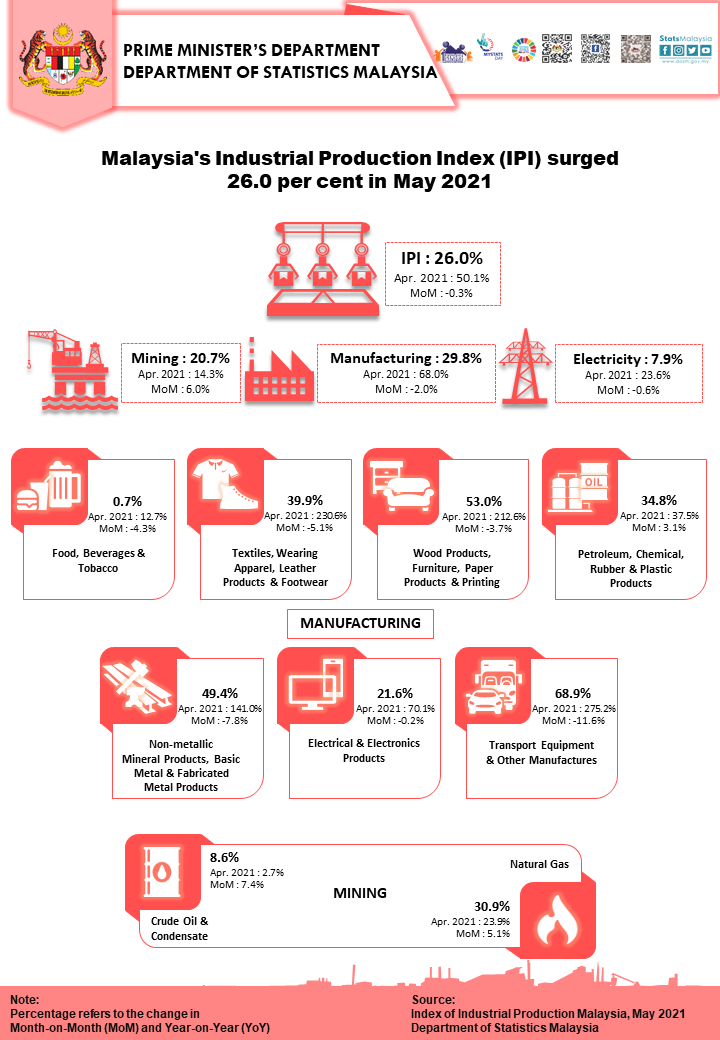 The Industrial Production Index (IPI) surged 26.0 per cent in May 2021 as compared to the same month of the previous year. The growth of IPI in May 2021 was underpinned by the expansion in all indices; Manufacturing index (29.8%), Mining index (20.7%) and Electricity index (7.9%).