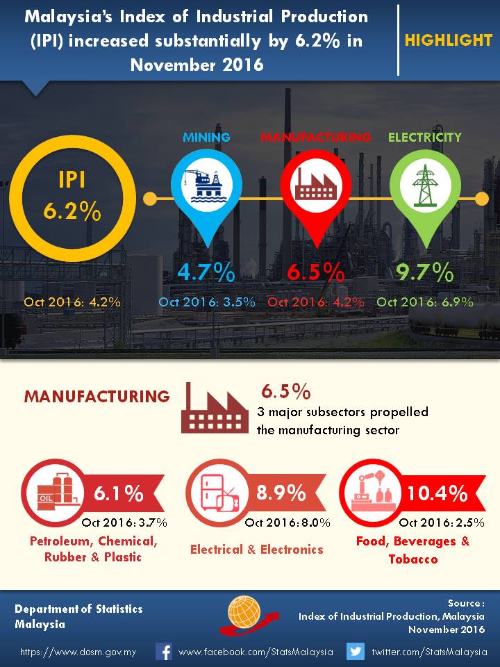 Malaysia’s Index of Industrial Production (IPI) increased substantially by 6.2% in November 2016