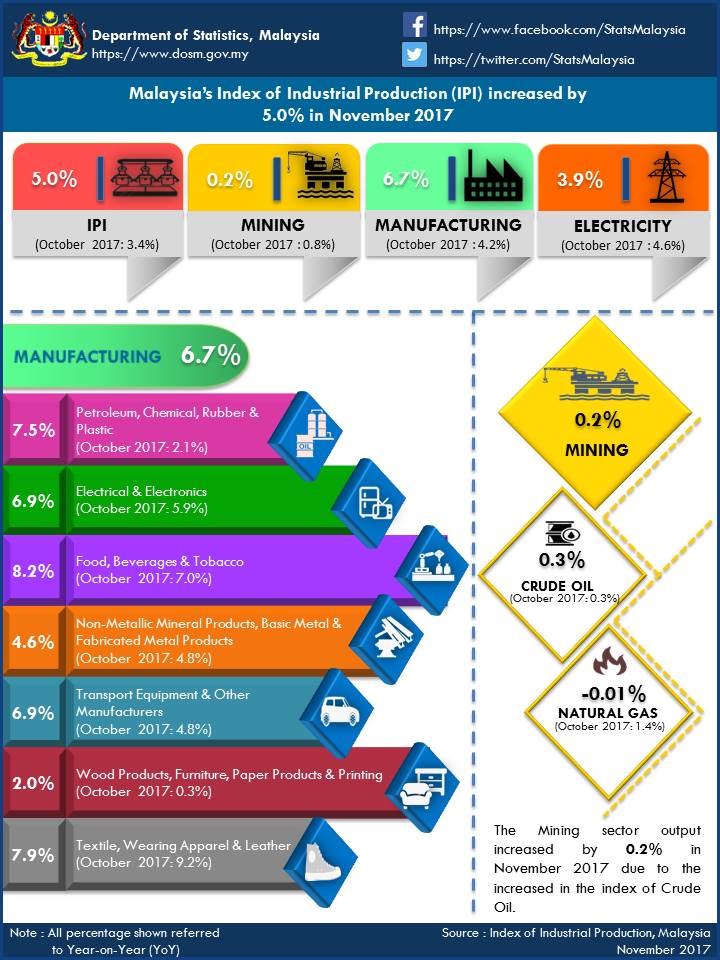 Malaysia’s Index of Industrial Production (IPI) grew by 5.0 per cent in November 2017