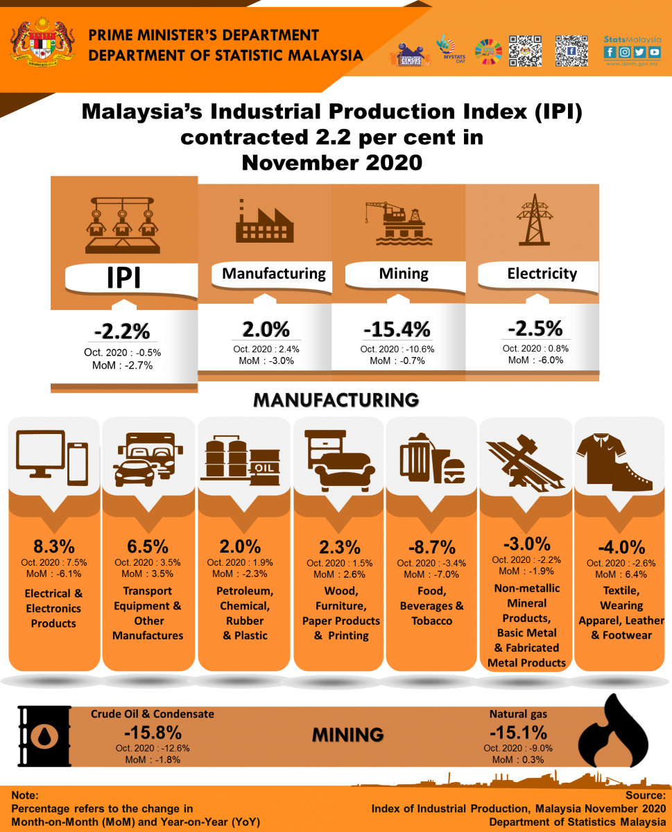 Malaysia’s Industrial Production Index (IPI) contracted 2.2 per cent in November 2020