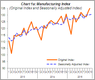 PERFORMANCE OF MANUFACTURING SECTOR Year-on-year, Manufacturing sector output expanded further by 6.2% in October 2015 after registering 5.6% in September 2015. The major sub-sectors which expanded in October 2015 were: Electrical and Electronics Products (13.9%); Petroleum, Chemical, Rubber and Plastic Products (3.3%) and Non-metallic Mineral Products, Basic Metal and Fabricated Metal Products (5.1%). On a seasonally adjusted month-on-month basis, Manufacturing output edged up 0.2% in October 2015. |