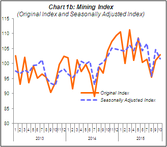 PERFORMANCE OF MINING SECTOR The Mining sector output decreased by 1.4% in October 2015 as compared to the same month in 2014 mainly due to the declined in Natural Gas index (5.3%), whilst, the Crude Oil index recorded a slower growth of 2.1%. On a seasonally adjusted terms, output for the Mining sector fell by 3.0% as compared to September 2015. |