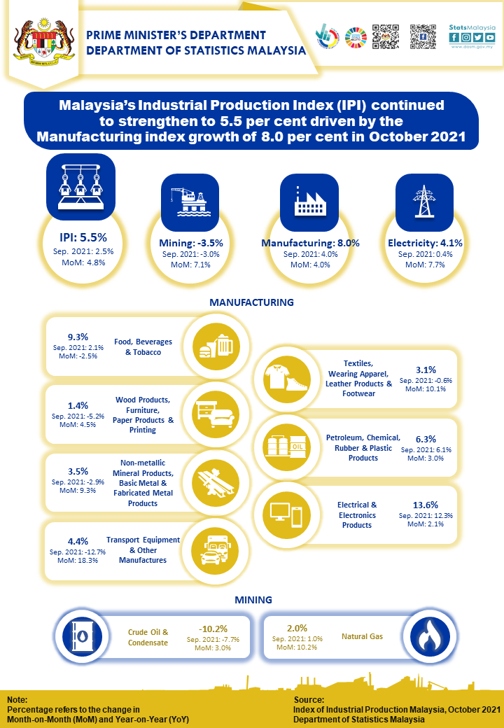 The Industrial Production Index (IPI) increased 5.5 per cent in October 2021 as compared to the same month of the previous year. The expansion of IPI was attributed by the increment of 8.0 per cent in Manufacturing index and 4.1 per cent in Electricity index. Meanwhile, Mining index recorded a downturn of 3.5 per cent.