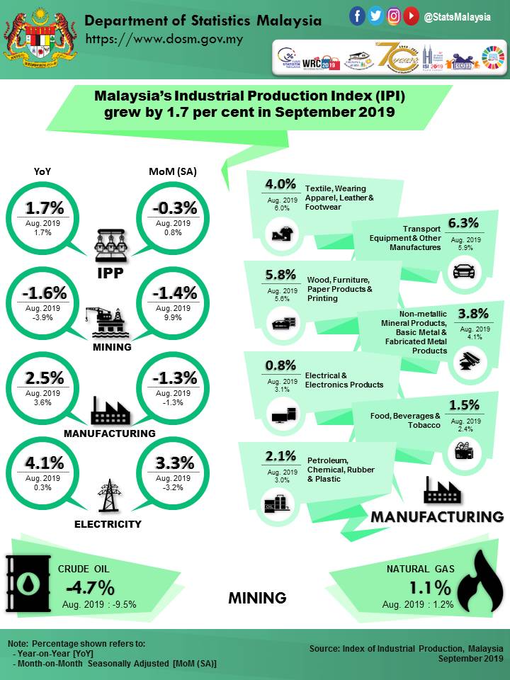 Malaysia’s Industrial Production Index (IPI) grew by 1.7 per cent in September 2019