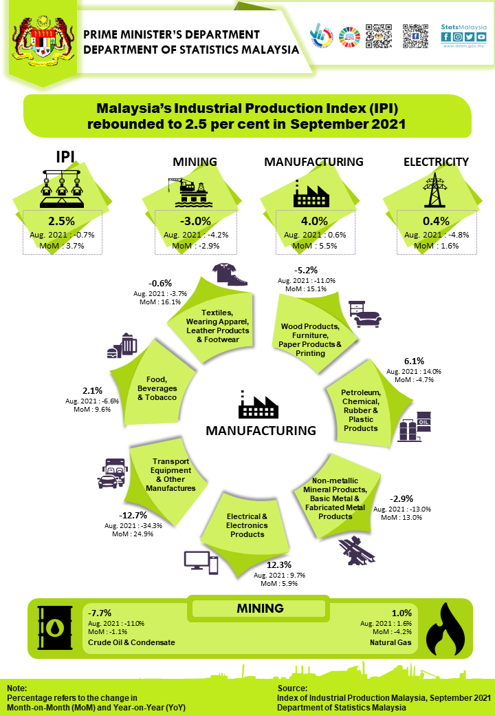 Malaysia’s Industrial Production Index (IPI) rebounded to 2.5 per cent in September 2021