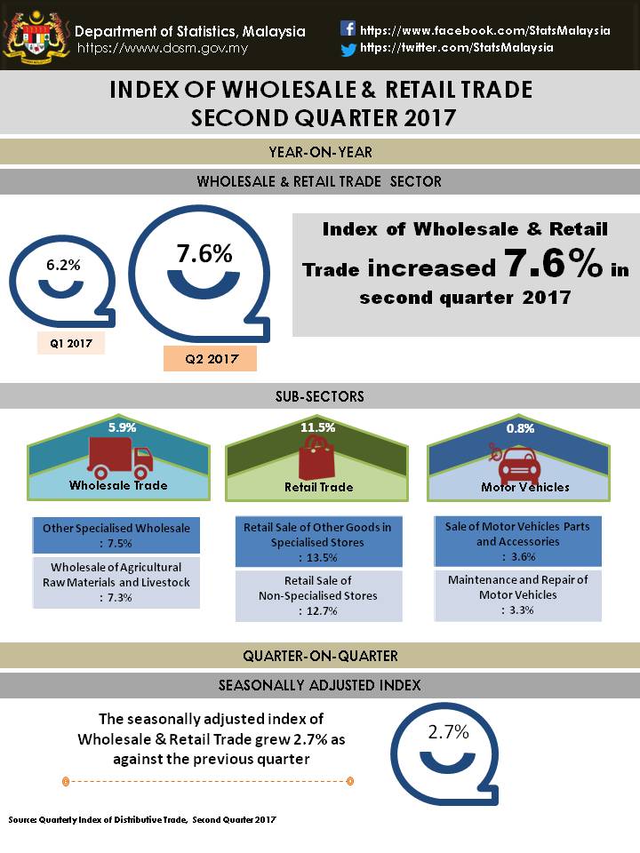 Index of Wholesale Trade registered an increase of 5.9 per cent to 165.9 points in the second quarter 2017 as compared to second quarter 2016. The increase was driven primarily by Other Specialised Wholesale (7.5%), Wholesale of Agricultural Raw Materials and Livestock (7.3%) and Wholesale of Machinery, Equipment and Supplies (6.2%).