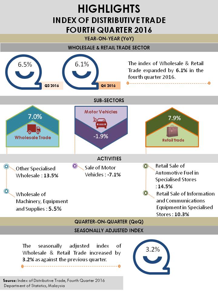 In fourth quarter 2016, the Retail Trade sub-sector registered an increase of  7.9 per cent year-on-year. The growth was supported by Retail Sale of Automotive Fuel in Specialised Stores  (14.5%), Retail Sale of Information and Communications Equipment in Specialised Stores  (10.3%) and Retail Sale of Other Goods in Specialised Stores  (9.2%).