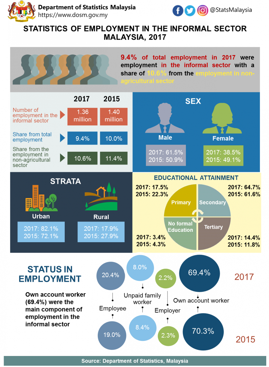 In 2017, there were 1.36 million employed persons in the informal sector comprising 9.4 per cent share of the total employment in Malaysia