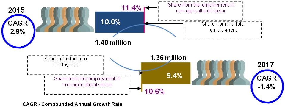 In 2017, there were 1.36 million employed persons in the informal sector comprising 9.4 per cent share of the total employment in Malaysia, lower than 2015 (10.0%). Meanwhile, the share of informal sector employment of the employment in non-agricultural sector was 10.6 per cent (2015: 11.4%). The annual growth rate of informal sector employment decreased 1.4 per cent in 2017 as compared to an increase of 2.9 per cent in 2015.