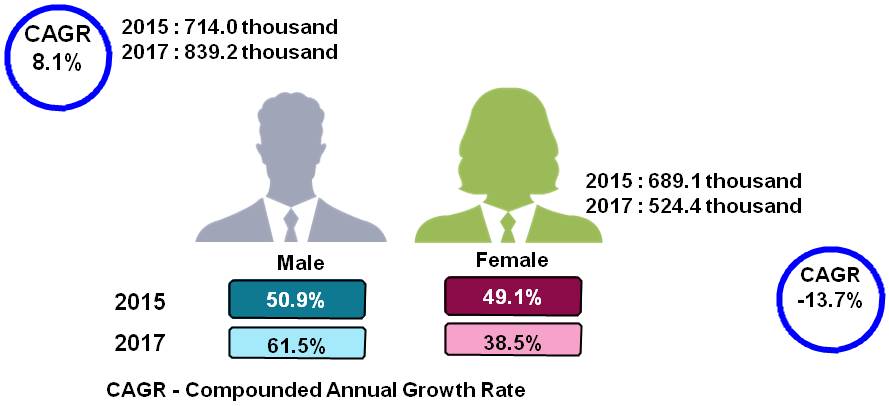 Employment in the informal sector for male in 2017 comprised of 839.2 thousand persons with an annual growth rate of 8.1 per cent. The percentage contribution for male employment increased 10.6 percentage points for that particular year to 61.5 per cent from 50.9 per cent in 2015.