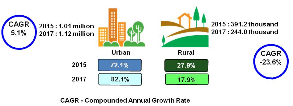 The majority employment in the informal sector was in the urban area encompassing 82.1 per cent (1.12 million persons) with an annual growth rate of 5.1 per cent. However, the number of informal sector employment in the rural area was 244.0 thousand persons, decreased by 23.6 per cent annually as compared to 391.2 thousand persons in 2015.