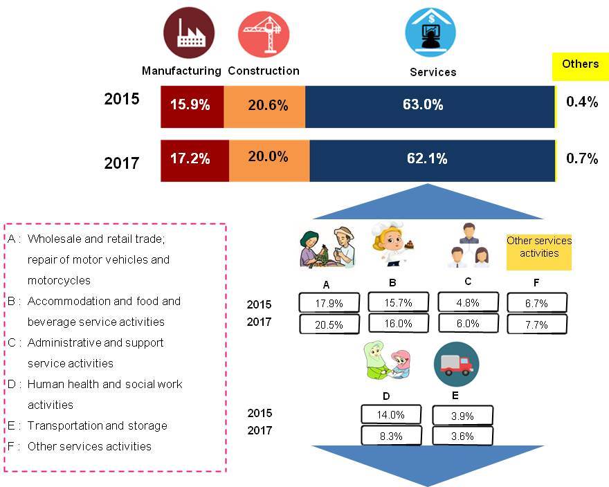 Wholesale and retail trade; repair of motor vehicles and motorcycles activities dominated Services industry with 20.5 per cent followed by Accommodation and food and beverage service activities (16.0%) and Human health and social work activities (8.3%).