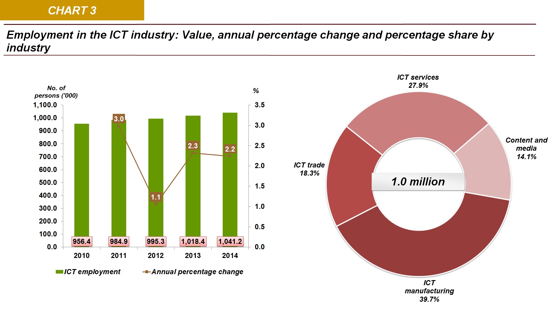Employment in the ICT industry rose by 2.2 per cent. The ICT industry contributed 7.7 per cent to the total employment. ICT manufacturing recorded the highest employment with a share of 39.7 per cent followed by ICT services 27.9 per cent (Chart 3).