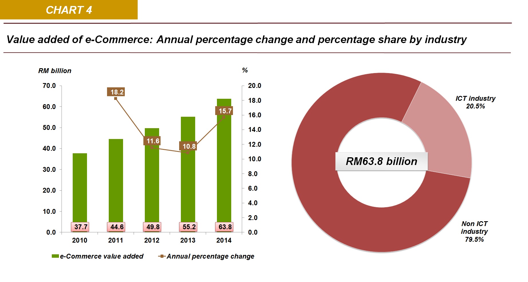 The total value added of e-Commerce in 2014 elevated to RM63.8 billion, an increase of RM8.6 billion from the previous year as shown in Chart 4. In terms of growth, the e-Commerce registered 15.7 per cent as against 10.8 per cent in 2013. The main contributor of e-Commerce was non ICT industry with a share of 79.5 per cent.