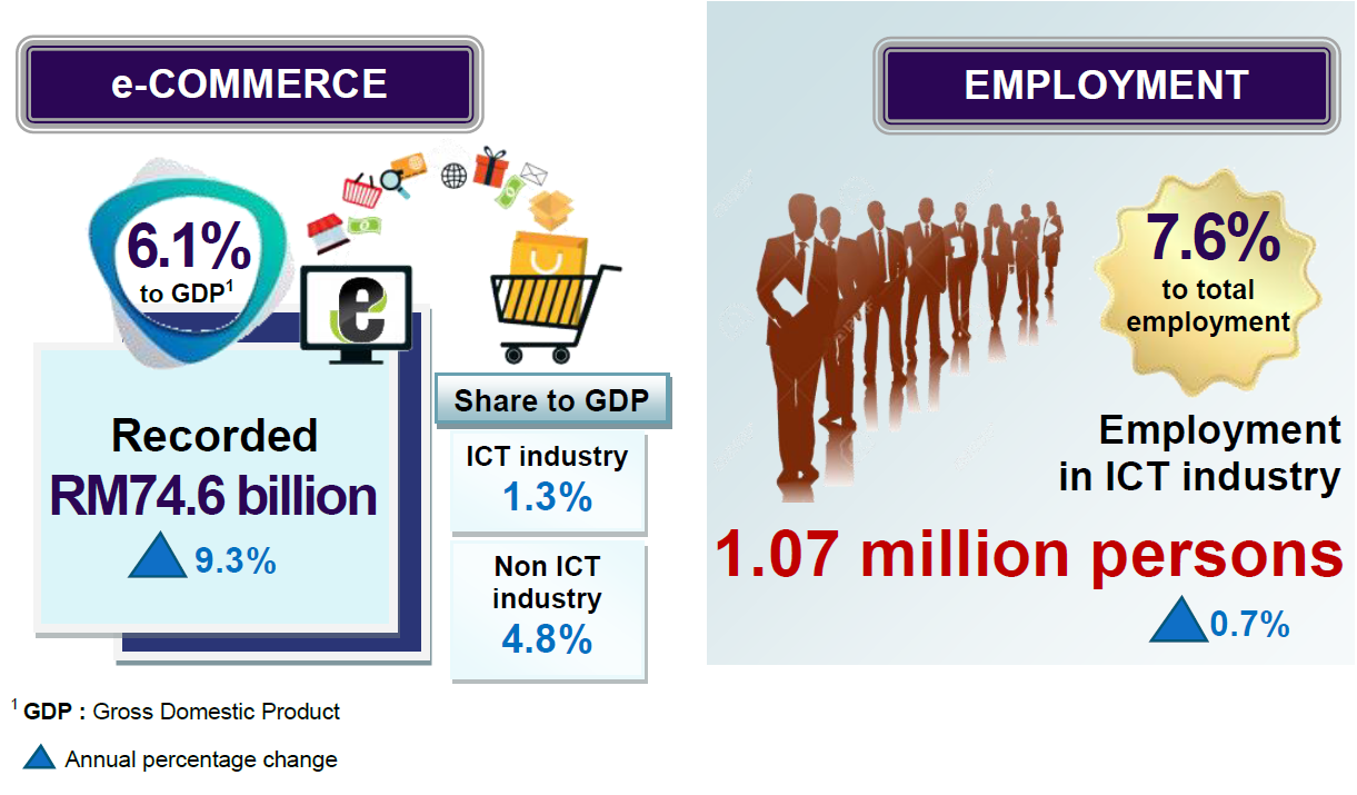 Contribution of e-Commerce to GDP recorded 6.1 per cent with a value of RM74.6 billion. Performance of e-Commerce rose to 9.3 per cent supported by non ICT industry which experienced a growth of 9.4 per cent.