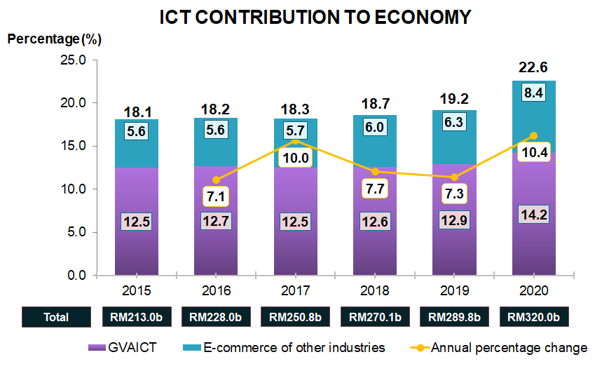 Contribution of Information and Communication Technology (ICT) to economy continued to expand at RM320.0 billion in 2020, registered a double-digit growth of 10.4 per cent compared to 7.3 per cent in the previous year. ICT contributed 22.6 per cent to Gross Domestic Product (GDP), comprises of Gross Value Added of ICT industry (GVAICT), 14.2 per cent and e-commerce of other industries, 8.4 per cent.