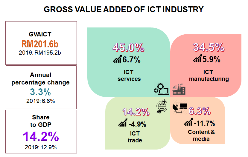 GVAICT registered a value of RM201.6 billion with a slower growth of 3.3 per cent in 2020 as against to 6.6 per cent in the preceding year. This was attributed by the decline in content & media and ICT trade industries with 11.7 per cent and 4.9 per cent respectively. However, the ICT manufacturing and ICT services industries continued to supported the growth of GVAICT with 5.9 per cent and 6.7 per cent.