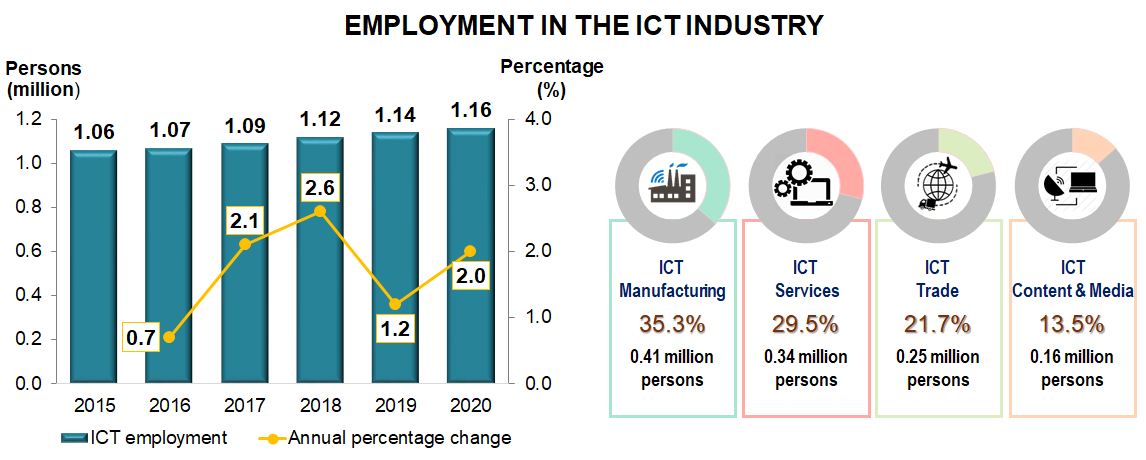 Employment in the ICT industry in 2020, amounted to 1.16 million persons with contribution of 7.7 per cent to total employment. ICT manufacturing industry was the main contributor with 35.3 per cent followed by ICT services (29.5%) and ICT trade (21.7%).