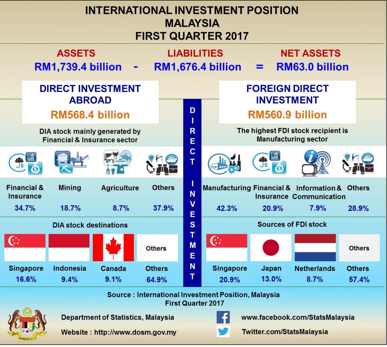 Malaysia's net international investment position as at end of March 2017 recorded a net assets position of RM63.0 billion (Q4 2016: RM70.1 billion). Total financial assets position expanded to RM1,739.4 billion and total liabilities registered RM1,676.4 billion. In the first quarter of 2017, Direct Investment Abroad (DIA) stock recorded RM568.4 billion (Q4 2016: RM566.0 billion) and Foreign Direct Investment (FDI) stock in Malaysia registered a value of RM560.9 billion (Q4 2016: RM546.6 billion).