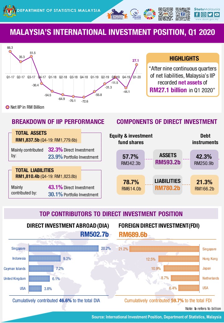 As at end of March 2020, Malaysia’s international investment position (IIP) recorded net assets position of RM27.1 billion after registering nine (9) consecutive quarters of net liabilities. Total financial assets increased to RM1,837.5 billion (Q4 2019: RM1,779.6 billion), while total liabilities was RM1,810.4 billion (Q4 2019: RM1,823.8 billion).
