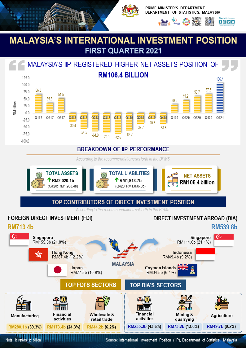 Direct Investment Abroad (DIA) position recorded a higher value of RM539.8 billion (Q4 2020: RM518.8 billion). The investment was primarily in Financial activities (43.6%), followed by Mining & quarrying (13.6%) and Agriculture (9.2%). As at end of Q1 2021, DIA position was predominantly in Asia region with a cumulative value of RM281.7 billion, whereby Singapore (21.1%) and Indonesia (9.2%) remained as the major DIA destinations. Meanwhile, Foreign Direct Investment (FDI) position in Malaysia also increased to RM713.4 billion from RM698.8 billion in previous quarter. Manufacturing sector was the largest contributor with a share of 39.3 per cent, followed by Financial activities (24.3%) and Wholesale & retail trade (6.2%). Asia region held the largest FDI position which amounted to RM389.9 billion (54.6%), most notably from Singapore (21.8%), Hong Kong (12.2%) and Japan (10.9%).