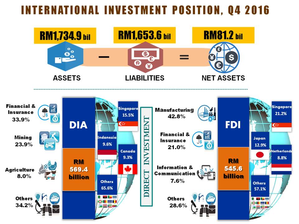 Malaysia's net international investment position at the end of December 2016 recorded a net assets position of RM81.2 billion (Q3 2016: RM26.5 billion). Total financial assets position expanded to RM1,734.9 billion and total liabilities registered RM1,653.6 billion. At the end of December 2016, Direct Investment Abroad (DIA) stock recorded RM569.4 billion (Q3 2016: RM539.8 billion) and Foreign Direct Investment (FDI) stock in Malaysia accounted for RM545.6 billion (Q3 2016: RM525.5 billion).