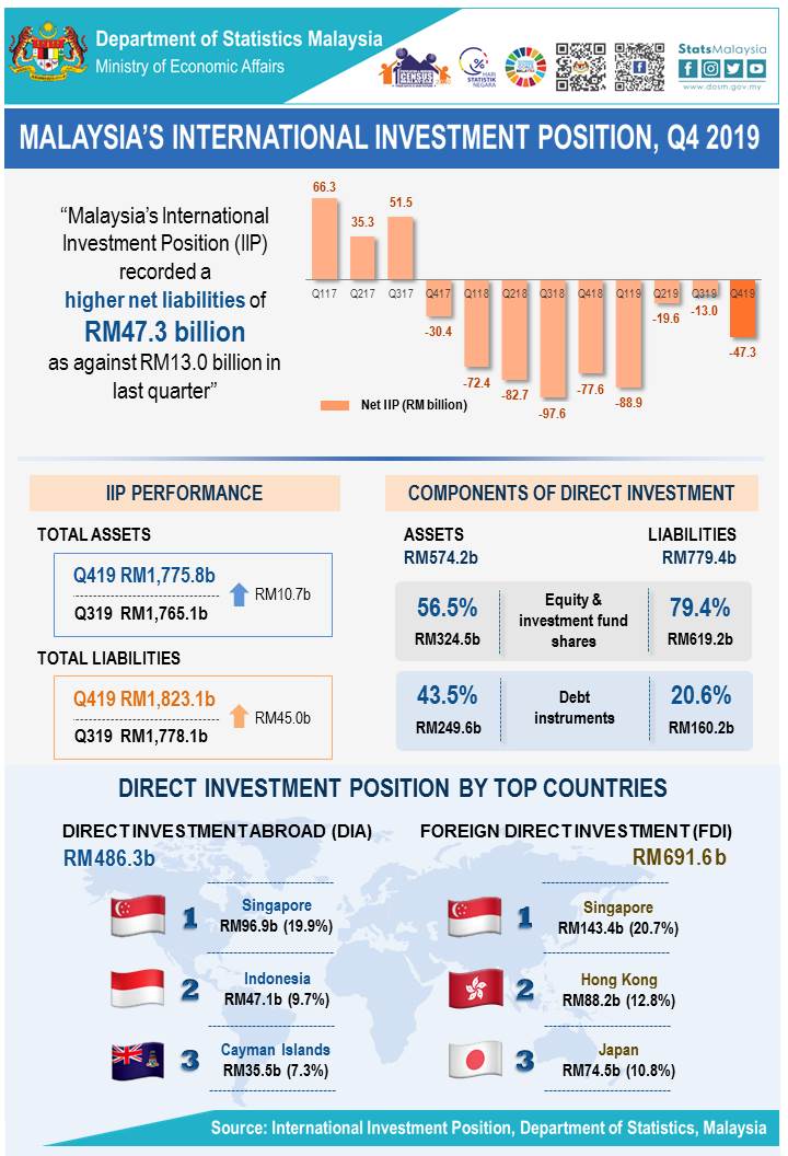 As at end of December 2019, Malaysia’s net international investment position (IIP) registered a higher net liabilities of RM47.3 billion (Q3 2019: net liabilities of RM13.0 billion). Total financial assets increased to RM1,775.8 billion (Q3 2019: RM1,765.1 billion), while total liabilities was RM1,823.1 billion (Q3 2019: RM1,778.1 billion).