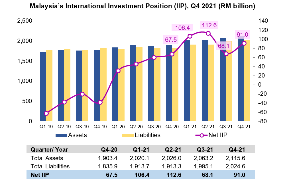 Malaysia’s International Investment Position (IIP) registered higher net assets of RM91.0 billion as at the end of December 2021 (Q3 2021: net assets of RM68.1 billion). Both total financial assets and liabilities increased to RM2,115.6 billion and RM2,024.6 billion, respectively.