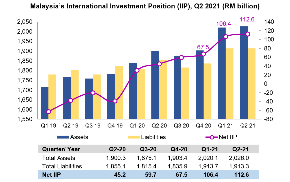 Malaysia’s International Investment Position (IIP) posted higher net assets position of RM112.6 billion as against RM106.4 billion in the last quarter, driven by an increase of RM5.9 billion in total financial assets to record RM2,026.0 billion. Meanwhile, total liabilities posted a value of RM1,913.3 billion, slightly decreased from RM1,913.7 billion in Q1 2021.