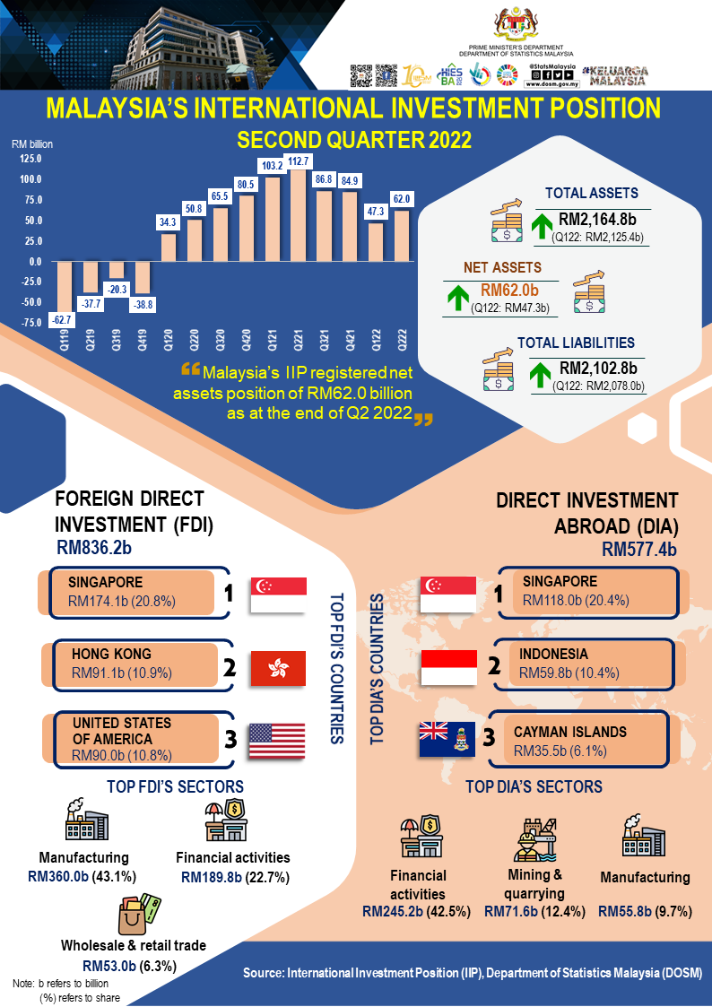 Malaysia’s International Investment Position (IIP) registered net assets of RM62.0 billion as at the end of second quarter 2022 (Q1 2022: net assets RM47.3 billion). Both total financial assets and liabilities increased to RM2,164.8 billion and RM2,102.8 billion, respectively.