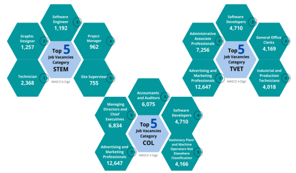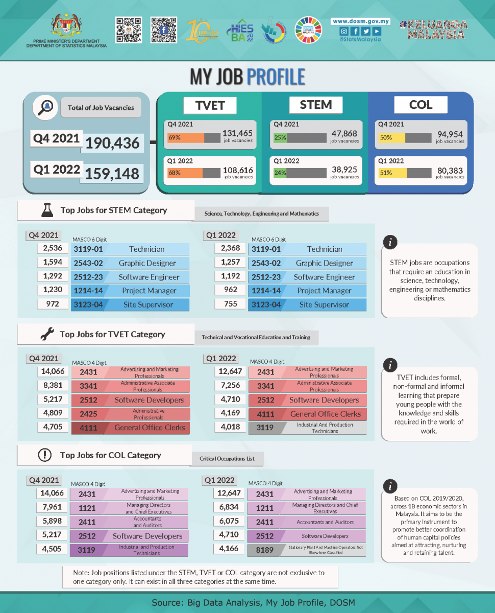 - In Q1 2022, the three (3) jobs in the Technical dan Vocational Education and Training (TVET) category that recorded the highest number of vacancies were Advertising and Marketing Professionals, Administrative Associate Professionals and Software Developers. Meanwhile, Advertising and Marketing Professionals, Managing Director and Chief Executive Officer as well as Accountants and Auditors were the highest Critical Occupation List (COL) category jobs advertised online during the reference period. In addition, popular jobs offered in the Science, Technology, Engineering and Mathematics (STEM) category were Technician, Graphic Designer and Software Engineer.