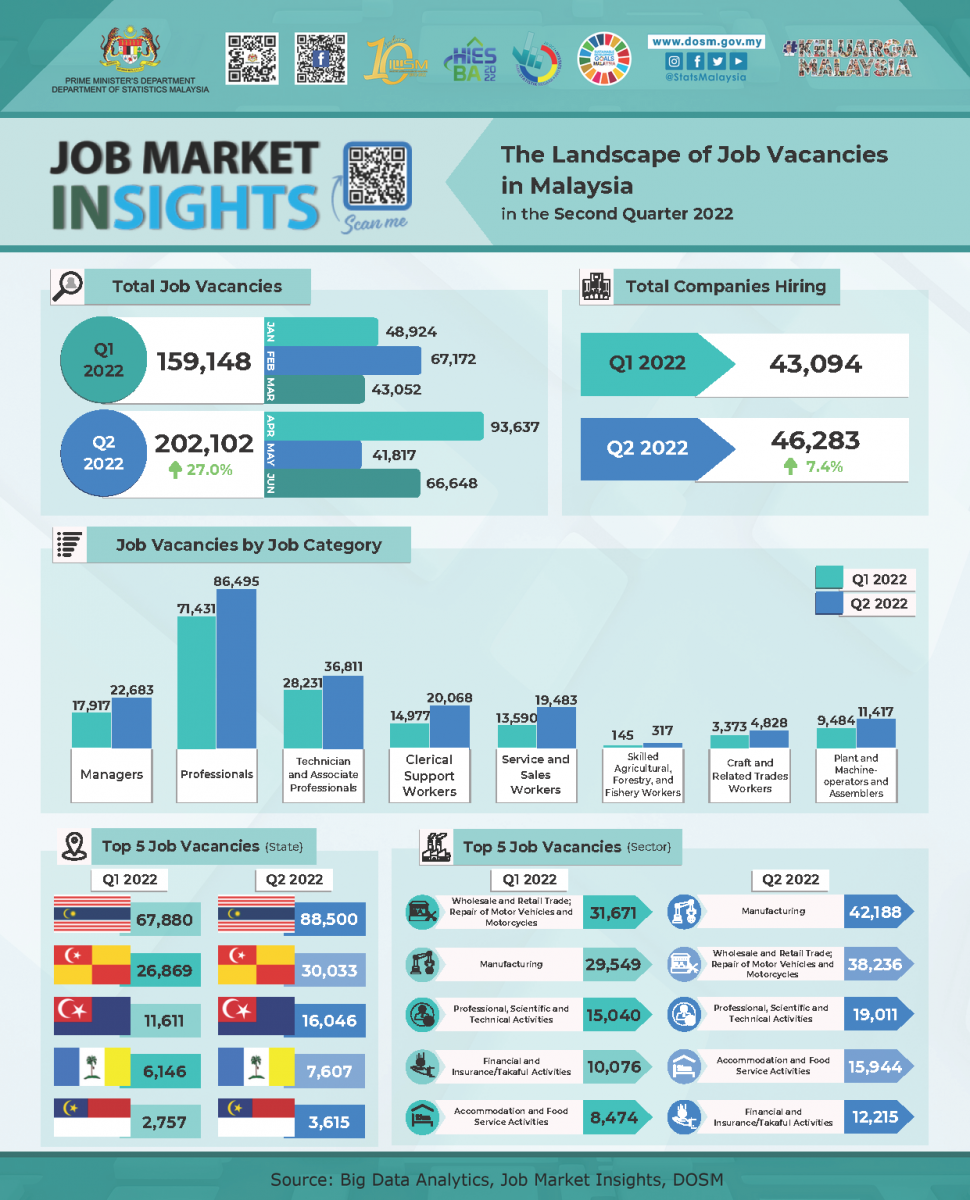 The detailed information and interactive data visualisation of both Job Market Insights and My Job Profile, Second Quarter of 2022 can be obtained through https://www.ilmia.gov.my/index.php/en/dashboard-datamart portal.