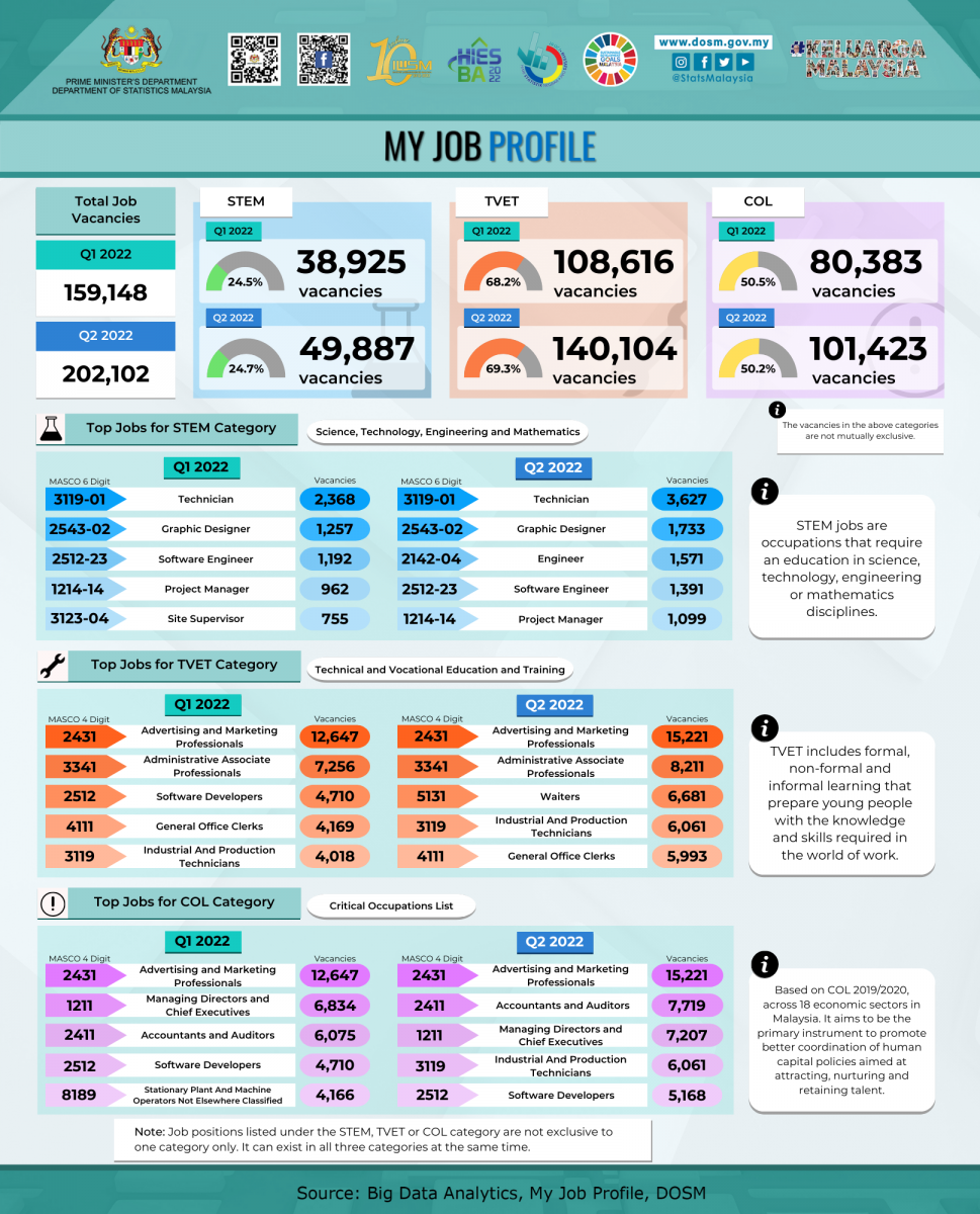 Job Market Insights and My Job Profile are quarterly releases based on the job vacancies advertised online by private popular recruitment websites. The report contains principal information on job vacancies namely by type of occupation, economic activity, state, skills and field of studies. These statistics must be interpreted with caution due to data limitation as this does not represent the whole population of job vacancies in Malaysia.
