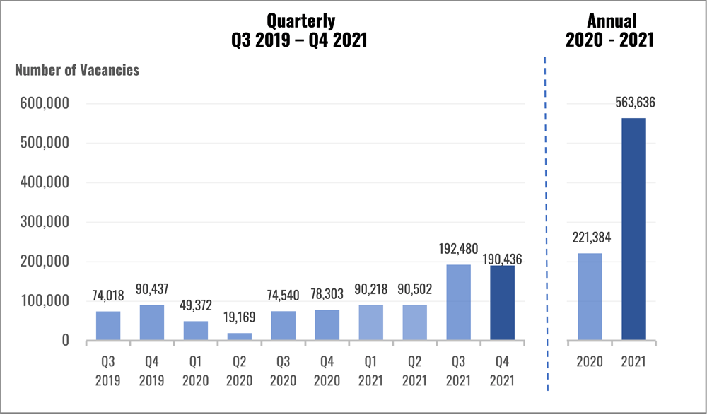 For the whole year of 2021, the number increased more than two-fold from 221,384 jobs advertised online in 2020 to 563,636 in 2021.
