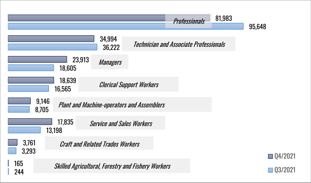 - The majority of jobs offered online in Q4 2021 were for Professional category workers (43.1%) and followed by Technicians and Associate Professionals (18.4%) and Managers (12.6%) category workers. By ranking, the top five most popular jobs offered during the reference period are Advertising and Marketing Professionals, Administrative Associate Professionals, Managing Directors and Chief Executives, Accountants and Auditors and Software Developers.