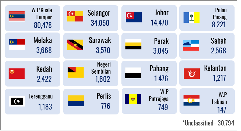 - By geographical, almost three-quarters of the total online job advertisement were concentrated in Wilayah Persekutuan Kuala Lumpur (80,478), Selangor (34,050), Johor (14,470), Pulau Pinang (8,221) and Melaka (3,668).