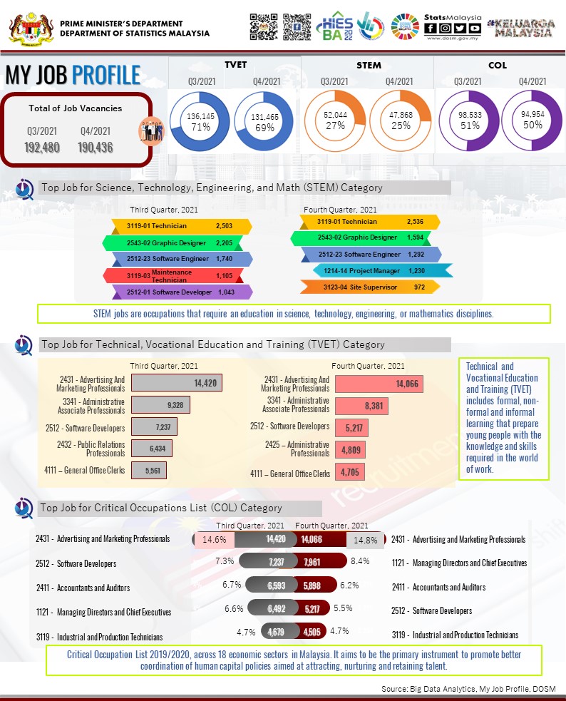 Job Market Insights and My Job Profile are quarterly releases by the Institute of Labour Market Information and Analysis (ILMIA), Department of Statistics, Malaysia (DOSM). These statistics are compiled based on the job vacancies advertised online by private popular recruitment websites in the reference period. The report contains information on job vacancies advertised online by employers from various aspects such as by the type of occupation, location, industry, skills, the field of studies, and others.