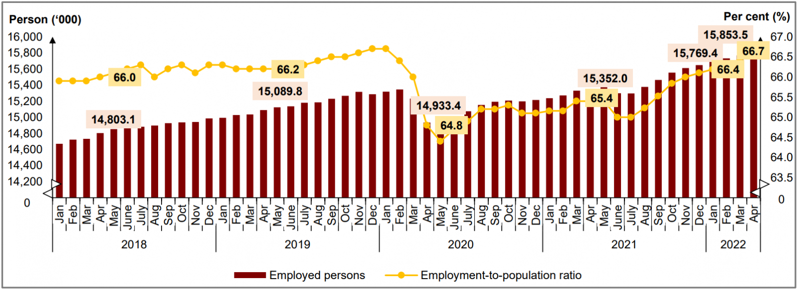 Chart 1: Employed persons and employment-to-population ratio, January 2018 - April 2022