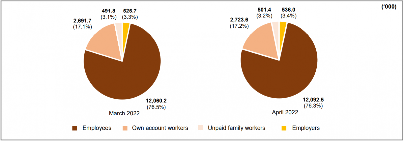 Chart 2: Employed person by status in employment, March and April 2022