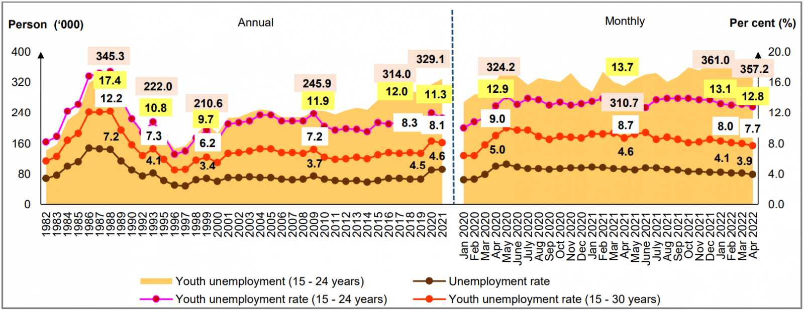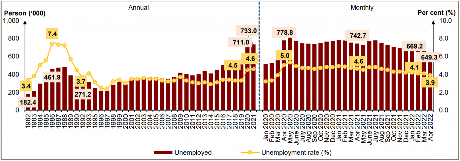 Chart 3: Unemployed persons and unemployment rate, 1982 - 2021 and January 2020 - April 2022