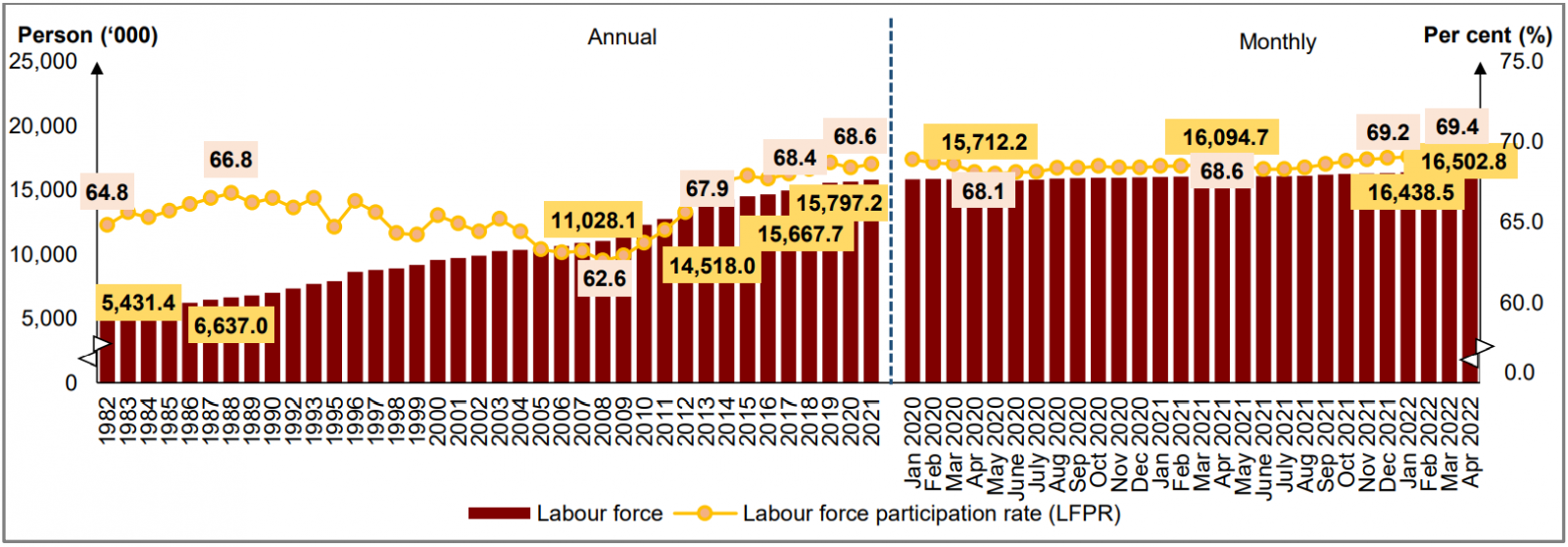 Chart 6: Labour force and LFPR, 1982 - 2021 and January 2020 - April 2022