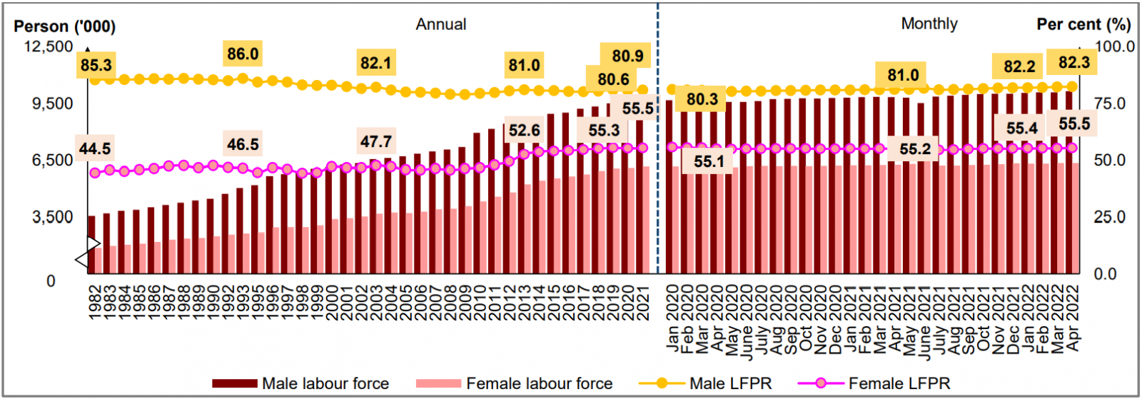 Chart 7: Labour force and LFPR by sex, 1982 - 2021 and January 2020 - April 2022