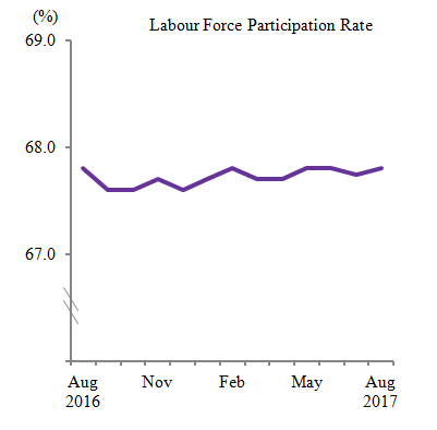 Labour force participation rate in August 2017 was 67.8 per cent, rose 0.1 percentage point compared to the previous month.